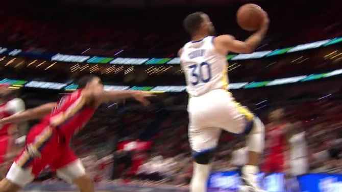 Draymond Green finds an opening between Pelicans defenders and connects with Steph Curry to pad the Warriors’ lead late.