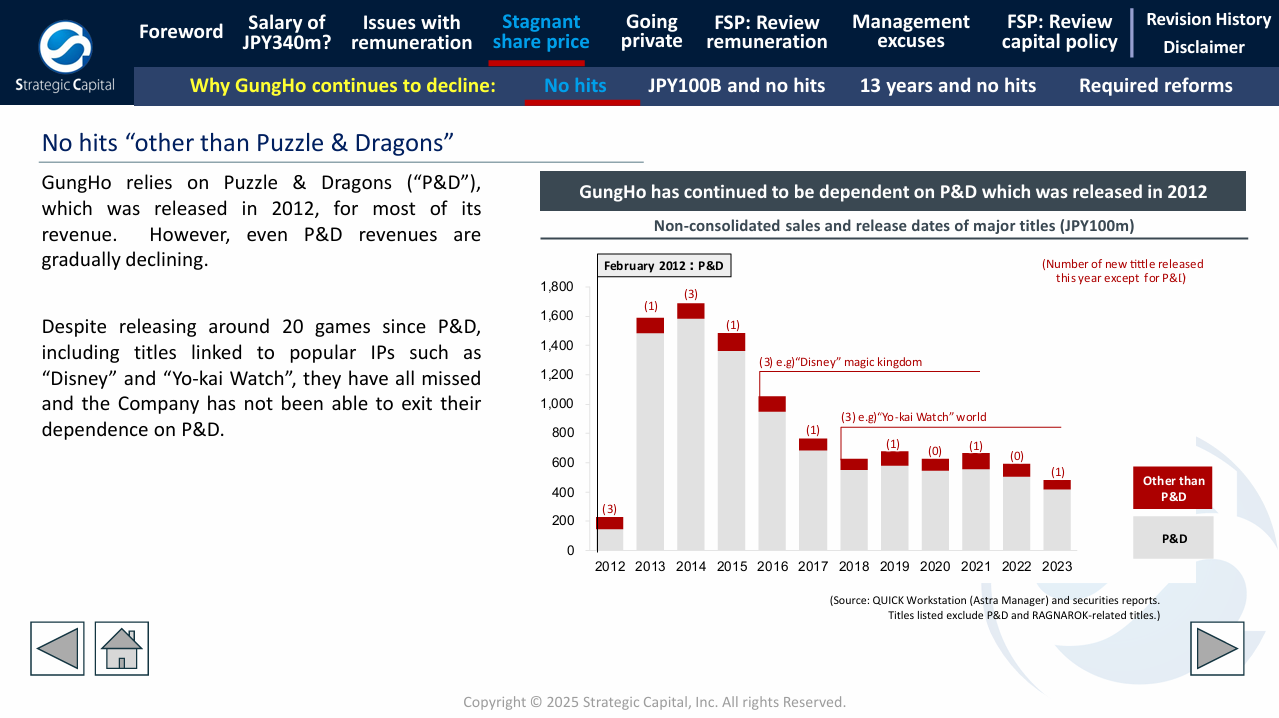 While the company has launched 20 games since 2012, including the popular IP of Disney and Yo-Kai Watch, the company has not been able to shake its Puzzle & Dragons dependence.