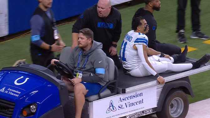 Lions’ players David Montgomery and Kalif Raymond head to the locker room with apparent injuries in the third quarter.