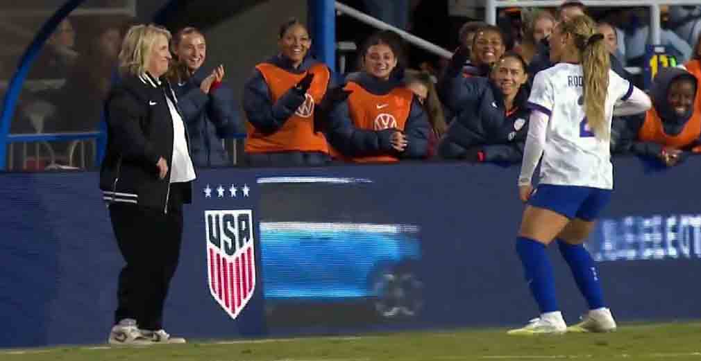 USWNT star Trinity Rodman delivered one of the most lighthearted moments of the night after finding the back of the net — and then convincing head coach Emma Hayes to join the celebration.
